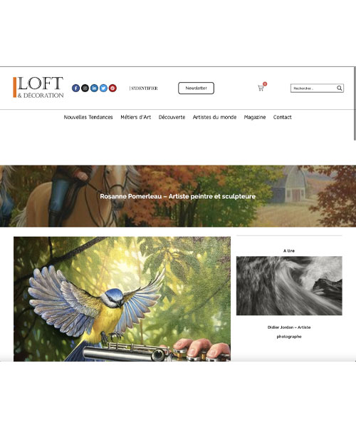 Parution de 2 pages à l’intérieur du Magazine international français » Loft et Décoration » de Paris, collection printemps été 2022. Je suis très heureuse de faire partie de cette collection qui est distribué en Europe jusqu’à Dubaï ! Vous pouvez voir mes oeuvres sur leur site sous les artistes du monde . https://loftetdecoration.com/rosanne-pomerleau-artiste-peintre-et-sculpteure/